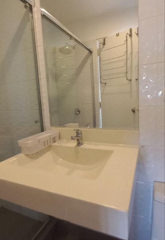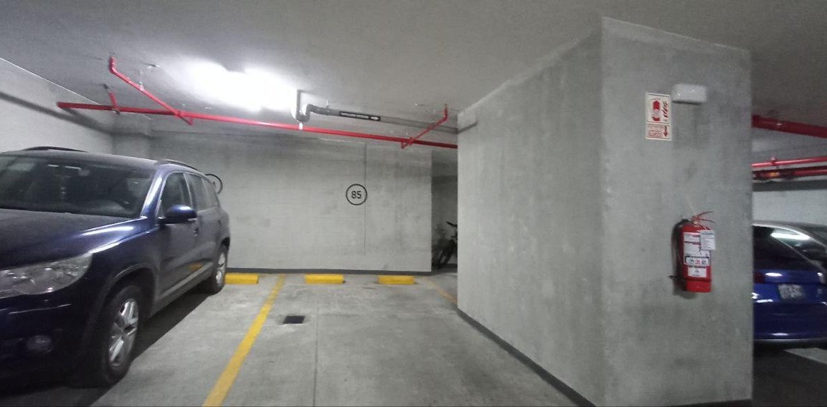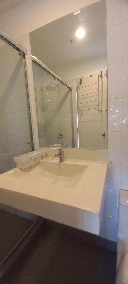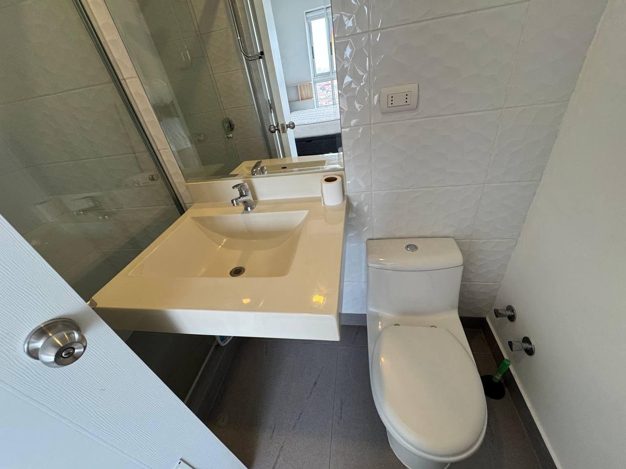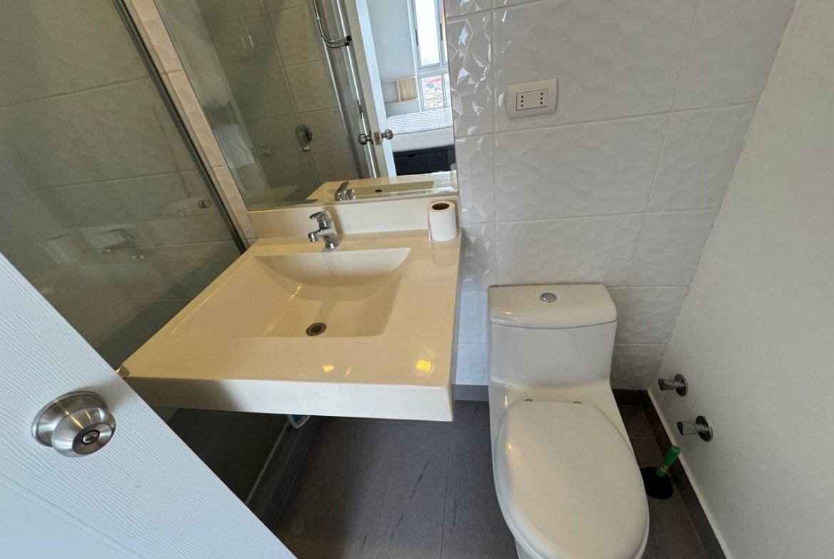 El baño es completo, destacando por sus puertas de ducha de vidrio templado y un amplio espejo. El departamento se ofrece con un estacionamiento cubierto por un precio adicional de S/ 300.00 soles.